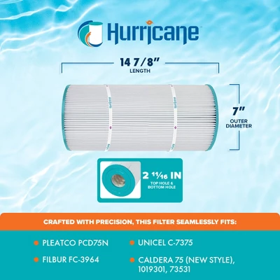 Dive into the realm of pristine waters with the Hurricane HF7375-01 Advanced Cartridge Filters, where unparalleled cleanliness awaits. Crafted with meticulous precision, these filters guarantee seamless compatibility with a range of models, including PCD75N, Unicel C-7375, Filbur FC-3964, Caldera 75 (New Style), 1019301, 73531 – Best Value USA Spa Filters, and other compatible models. With dimensions measuring 14.88 inches in length, an outer diameter of 7 inches, a top hole of 2.69 inches, and a bottom hole of 2.69 inches, achieving an ideal fit with these filter cartridges is effortless—measure your current filters for a flawless match.Experience a new level of filtration prowess with the advanced point bond filter media of these spa essentials, elevating filtration effectiveness beyond traditional non-woven materials. From biomass to dirt, debris, hair, leaves, and even critters, these filter cartridges are formidable barriers, leaving your pool or spa immaculate and inviting. Esteemed by both industry professionals and homeowners, these spa accessories are meticulously engineered for durability, ensuring prolonged service life and effortless upkeep. Bid farewell to the inconvenience of frequent replacements and welcome substantial savings on filters, all while minimizing wear and tear on your pump.Discover the exceptional cleaning prowess of the Hurricane HF7375-01 Advanced Cartridge Filters, your ultimate solution for pristine waters and unparalleled excellence.