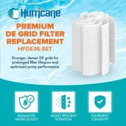 Meticulously fashioned with unwavering precision and tailored for unparalleled performance, this 36-square-foot DE Grid Filter Replacement from Hurricane emerges as the ultimate benchmark for achieving crystal-clear pool water.Designed to surpass expectations, this filter replacement offers unparalleled compatibility with leading brands such as PFS1836, FG-2003, FC-9530, and Hayward DEX3600 DA/DS. Boasting a generous 36 square feet of filter surface area, this filter set includes 7 full grids, each measuring 11 inches wide by 18 inches tall, and 1 partial smaller grid measuring 9 3/4 inches in width and 18 inches tall. With a total of 8 grids, every corner of your pool is safeguarded against impurities with this clean pool essential. Seamless integration meets effortless installation with the HFDE36-SET pool and spa filter. Engineered to fit flawlessly with your existing DE Filter Element Locator, installation is a breeze, requiring just a few minutes of your time. Bid farewell to cumbersome setups and hello to hassle-free maintenance.Experience the pinnacle of filtration technology as you revel in crystal-clear water with Hurricane Filters HFDE36-SET. Transform your pool and spa system into a sanctuary of serenity, where every dip is a rejuvenating experience. Embrace the superior quality and undeniable value of Hurricane Filters HFDE36-SET, because your oasis deserves nothing less.