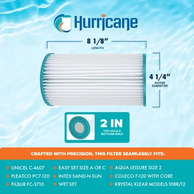 Dive into pristine waters with the Hurricane HF4607-02 Advanced Cartridge Filter, where unparalleled cleanliness awaits. Crafted with meticulous precision, this filter guarantees seamless compatibility with Unicel: C-4607, PC7-120, Filbur FC-3710, Coleco F-120 with core, Sand-n-Sun, Easy Set Size A or C, Wet Set, Aqua Leisure Size 2, Krystal Klear Models 108R/12, and other compatible models. With dimensions measuring 8.13 inches in length, an outer diameter of 4.25 inches, a top hole of 2 inches, and a Bottom hole of 2 inches, achieving an ideal fit with this filter cartridge is effortless, measure your current filter for a flawless match.Experience a new level of filtration prowess with the advanced point bond filter media of this spa essential, elevating filtration effectiveness beyond traditional non-woven materials. From biomass to dirt, debris, hair, leaves, and even critters, this pool filter is a formidable barrier, leaving your pool or spa immaculate and inviting. Esteemed by both industry professionals and homeowners, this spa accessory is meticulously engineered for durability, ensuring prolonged service life and effortless upkeep. Bid farewell to the inconvenience of frequent replacements and welcome substantial savings on filters, all while minimizing wear and tear on your pump.Discover the exceptional cleaning prowess of the Hurricane HF4607-02 Advanced Cartridge Filter, your ultimate solution for pristine waters and unparalleled excellence.