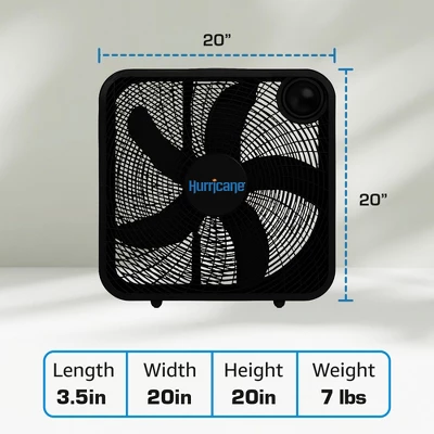 Experience the ultimate cooling comfort with the Hurricane 20-inch Classic Series Floor Box Fan.Designed for versatility and efficiency, this fan is a must-have for any space, from homes to greenhouses, garages to workshops. Featuring a highly portable design, this fan for your bedroom allows you to enjoy a refreshing breeze wherever you go. Equipped with 3 efficient speed settings, you can easily customize the airflow from this portable fan to suit your needs. Whether you prefer a gentle breeze or a powerful gust, this box fan delivers with its quiet yet powerful motor. Running at 2400 CFM and 1100 RPM on high ensures maximum airflow output while keeping noise to a minimum. Convenience is essential with the Hurricane Classic. Featuring a slim frame, adjustable feet, and power cord tucking compartment, this cooling fan makes storage a breeze. Whether you need to tuck this floor fan away in a corner or transport it from room to room, this fan makes it effortless. Thanks to its space-saving design, you can place this room fan virtually anywhere. Whether in a window, on furniture, or directly on the floor, its compact size ensures it fits seamlessly into any environment. Measuring just 20 inches by 20 inches with a depth of 3.5 inches, it takes up minimal space while delivering maximum performance.Refrain from settling for subpar cooling solutions. Support in the Hurricane 20-inch Classic Series Floor Box Fan and experience the difference firsthand. Stay calm, comfortable, and refreshed, no matter where you are.