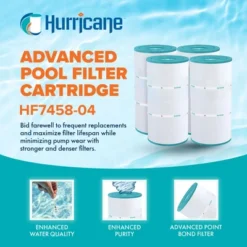 Dive into the realm of pristine waters with the Hurricane Filters HF7458-04 Advanced Cartridge Filters, where unparalleled cleanliness awaits. Crafted with meticulous precision, this filter guarantees seamless compatibility with a range of models including Unicel C-7458, Pleatco PA56SV, Filbur FC-1223, Hayward SwimClear C2025, CX480XRE and other compatible models. With dimensions measuring 14.19 inches in length, an outer diameter of 7 inches, and top and bottom holes being 3 inches, achieving an ideal fit is effortless, measure your current filter for a flawless match.Experience a new level of filtration prowess with the advanced point bond filter media of this pool essential, elevating filtration effectiveness beyond traditional non-woven materials. From biomass to dirt, debris, hair, leaves, and even critters, this filter cartridge is a formidable barrier, leaving your pool or spa immaculate and inviting. Esteemed by both industry professionals and homeowners, this pool filtration accessory is meticulously engineered for durability, ensuring prolonged service life and effortless upkeep. Bid farewell to the inconvenience of frequent replacements and welcome substantial savings on filters, all while minimizing wear and tear on your pump.Discover the exceptional cleaning prowess of the Hurricane Filters HF7458-04 Advanced Cartridge Filters, your ultimate solution for pristine waters and unparalleled excellence.