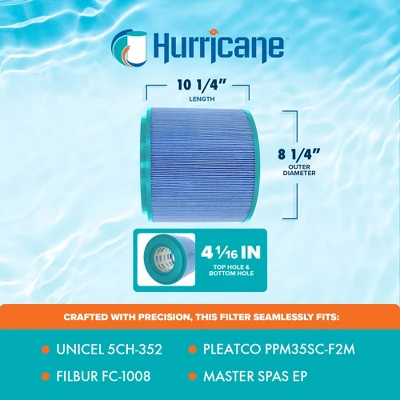 Dive into the realm of pristine waters with the Hurricane HF8341-01 Advanced Cartridge Filter, where unparalleled cleanliness awaits. Crafted with meticulous precision, this filter guarantees seamless compatibility with a range of models including Unicel 5CH-352, PPM35SC-F2M, Filbur FC-1008, Master Spas EP (new style), and other compatible models. With dimensions measuring 7.19 inches in length, an outer diameter of 8.25 inches, and the top and bottom holes being 4.06 inches, achieving an ideal fit with this filter cartridge is effortless, measure your current filter for a flawless match.Experience a new level of filtration prowess with the advanced point bond filter media of this spa essential, elevating filtration effectiveness beyond traditional non-woven materials. From biomass to dirt, debris, hair, leaves, and even critters, this filter cartridge is a formidable barrier, leaving your pool or spa immaculate and inviting. Esteemed by both industry professionals and homeowners, this spa accessory is meticulously engineered for durability, ensuring prolonged service life and effortless upkeep. Bid farewell to the inconvenience of frequent replacements and welcome substantial savings on filters, all while minimizing wear and tear on your pump.Discover the exceptional cleaning prowess of the Hurricane HF8341-01 Advanced Cartridge Filter, your ultimate solution for pristine waters and unparalleled excellence.
