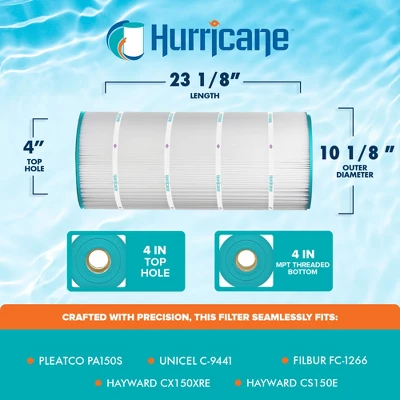 Dive into pristine waters with the Hurricane HF9441-01 Advanced Cartridge Filter, where unparalleled cleanliness awaits. Crafted with meticulous precision, this filter guarantees seamless compatibility with Pleatco PA150S, Unicel C-9441, Filbur FC-1266, Hayward CS150E, Hayward CX150XRE, SwimClear C150S, and other compatible models. With dimensions measuring 23.125 inches in length, an outer diameter of 10.125 inches, a top hole, and a bottom hole of 4 inches, achieving an ideal fit with this filter cartridge is effortless; measure your current filter for a flawless match.Experience a new level of filtration prowess with the advanced point bond filter media of this spa essential, elevating filtration effectiveness beyond traditional non-woven materials. From biomass to dirt, debris, hair, leaves, and even critters, this pool filter is a formidable barrier, leaving your pool or spa immaculate and inviting. Esteemed by both industry professionals and homeowners, this spa accessory is meticulously engineered for durability, ensuring prolonged service life and effortless upkeep. Bid farewell to the inconvenience of frequent replacements and welcome substantial savings on filters, all while minimizing wear and tear on your pump.Discover the exceptional cleaning prowess of the Hurricane HF9441-01 Advanced Cartridge Filter, your ultimate solution for pristine waters and unparalleled excellence.