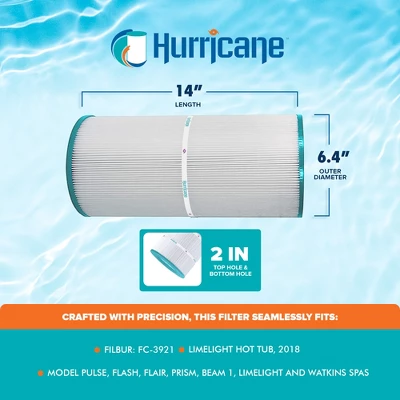 Dive into the realm of pristine waters with the Hurricane HFLIME14-01 Advanced Cartridge Filter, where unparalleled cleanliness awaits. Crafted with meticulous precision, this filter guarantees seamless compatibility with a range of models including Filbur: FC-3921, Limelight Hot Tub, 2018 and model Pulse, Flash, Flair, Prism, Beam 1, Limelight and Watkins Spas and other compatible models. With dimensions measuring 14 inches in length, an outer diameter of 6.38 inches, the top closed with a strong handle, and the bottom hole being 2 inches MPT threaded, achieving an ideal fit with this filter cartridge is effortless, measure your current filter for a flawless match.Experience a new level of filtration prowess with the advanced point bond filter media of this spa essential, elevating filtration effectiveness beyond traditional non-woven materials. From biomass to dirt, debris, hair, leaves, and even critters, this filter cartridge is a formidable barrier, leaving your pool or spa immaculate and inviting. Esteemed by both industry professionals and homeowners, this spa accessory is meticulously engineered for durability, ensuring prolonged service life and effortless upkeep. Bid farewell to the inconvenience of frequent replacements and welcome substantial savings on filters, all while minimizing wear and tear on your pump.Discover the exceptional cleaning prowess of the Hurricane HFLIME14-01 Advanced Cartridge Filter, your ultimate solution for pristine waters and unparalleled excellence.