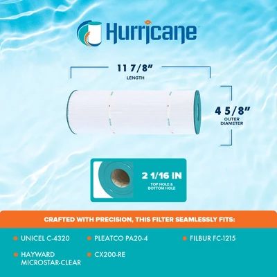 Dive into the realm of pristine waters with the Hurricane HF4320-01 Advanced Cartridge Filter, where unparalleled cleanliness awaits. Crafted with meticulous precision, this filter guarantees seamless compatibility with a range of models including Unicel C-4320, PA20-4, Filbur FC-1215, Hayward MicroStar-Clear, CX200-RE, C-200RE, American Commander II, 17-175-1035, 17-175-1308, APCC7049, APCC7051, 090164200002, 40204, AK-3008, and other compatible models. With dimensions measuring 11.88 inches in length, an outer diameter of 4.63 inches, and top and bottom holes being 2.06 inches, achieving an ideal fit is effortless, measure your current filter for a flawless match.Experience a new level of filtration prowess with the advanced point bond filter media of this spa essential, elevating filtration effectiveness beyond traditional non-woven materials. From biomass to dirt, debris, hair, leaves, and even critters, this filter cartridge is a formidable barrier, leaving your pool or spa immaculate and inviting. Esteemed by both industry professionals and homeowners, this spa accessory is meticulously engineered for durability, ensuring prolonged service life and effortless upkeep. Bid farewell to the inconvenience of frequent replacements and welcome substantial savings on filters, all while minimizing wear and tear on your pump.Discover the exceptional cleaning prowess of the Hurricane HF4320-01 Advanced Cartridge Filter, your ultimate solution for pristine waters and unparalleled excellence.