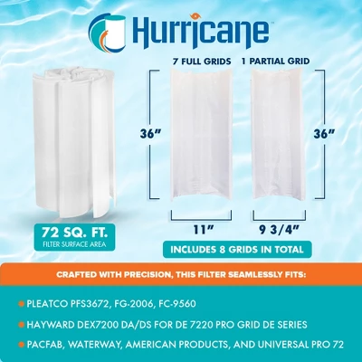 Meticulously fashioned with unwavering precision and tailored for unparalleled performance, this 72-square-foot DE Grid Filter Replacement from Hurricane emerges as the ultimate benchmark for achieving crystal-clear pool water.Designed to surpass expectations, this filter replacement offers unparalleled compatibility with leading brands such as PFS3672, FG-2006, FC-9560, Hayward DEX7200 DA/DS for DE 7220 Pro Grid DE Series PacFab, Waterway, American Products, and Universal Pro 72. Boasting a generous 72 square feet of filter surface area, this pool essential includes 7 full grids, each measuring 11 inches wide by 36 inches tall, and 1 partial smaller grid measuring 9-3/4 inches in width and 36 inches tall. With a total of 8 grids, every corner of your pool is safeguarded against impurities. Seamless integration meets effortless installation with HF-DE72-SET. Engineered to fit flawlessly with your existing DE Filter Element Locator, installation is a breeze for this grid filter replacement part, requiring just a few minutes of your time. Bid farewell to cumbersome setups and hello to low maintenance.Experience the pinnacle of filtration technology as you revel in crystal-clear water with Hurricane Filters HF-DE72-SET. Transform your pool and spa system into a sanctuary of serenity, where every dip is a rejuvenating experience. Embrace the superior quality and undeniable value of Hurricane Filters HF-DE72-SET, because your oasis deserves nothing less.