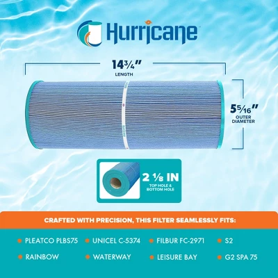 Dive into the realm of pristine waters with the Hurricane HF5374-01M Elite Aseptic Cartridge Filter, where unparalleled cleanliness awaits. Crafted with meticulous precision, this filter guarantees seamless compatibility with a range of models including PLBS75, Unicel C-5374, Filbur FC-2971, Rainbow, Waterway, Leisure Bay, S2, G2 Spa 75, and other compatible models. With dimensions measuring 14.81 inches in length, an outer diameter of 5.31 inches, and top and bottom holes being 2.13 inches, achieving an ideal fit with this filter cartridge is effortless, measure your current filter for a flawless match.Experience a new level of filtration prowess with the aseptic point bond filter media of this spa essential, elevating filtration effectiveness beyond traditional non-woven materials. From biomass to dirt, debris, hair, leaves, and even critters, this filter cartridge is a formidable barrier, leaving your pool or spa immaculate and inviting. Esteemed by both industry professionals and homeowners, this spa accessory is meticulously engineered for durability, ensuring prolonged service life and effortless upkeep. Bid farewell to the inconvenience of frequent replacements and welcome substantial savings on filters, all while minimizing wear and tear on your pump.Discover the exceptional cleaning prowess of the Hurricane HF5374-01M Elite Aseptic Cartridge Filter, your ultimate solution for pristine waters and unparalleled excellence.